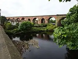 The Borough of Stockton-on-Tees is a unitary authority area in England with borough status in County Durham and North Yorkshire. In 2021, it had a population of 196,600.[5] The main settlement and namesake of the borough is Stockton-on-Tees, which lies on the north bank of the River Tees in County Durham, along with the towns of Billingham and Norton-on-Tees. The borough also includes the towns of Ingleby Barwick, Thornaby-on-Tees and Yarm, all south of the Tees, in North Yorkshire. Bridges spanning the River Tees include the Yarm Viaduct and the Tees Transporter Bridge. The borough is locally governed by Stockton-on-Tees Borough Council and forms part of the Tees Valley together with the boroughs of Darlington, Middlesbrough, Redcar and Cleveland and Hartlepool. Teesside International Airport is partly within the borough.