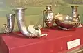 - A rhyta jug with images gods at a feast, scenes showing the mythological cycles, with images of Dionysus and Heracles, satyrs, griffons, and sphinxes.[4]