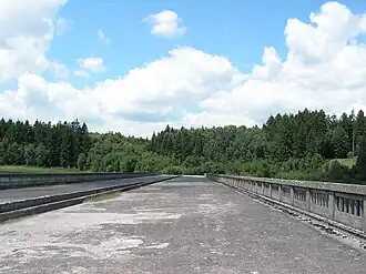 The dam has been in operation since 1976 and the sector of the D1 highway since 1977. The Borovsko Bridge and the Sedmpanský Bridge were abandoned, as were the routes a few kilometres west and east from the bridges' location. Today, huge spans of the Borovsko Bridge have been flooded almost up to the roadway. The bridge rests unseen in the middle of the forests of the Bohemian-Moravian Highlands, as the whole lake district is a forbidden area and entry is strictly prohibited to protect the watershed.[1]