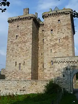 The castle was built at the site of an earlier structure, and it remains the Borthwick family ancestral seat. Sir William Borthwick, later the 1st Lord, obtained from King James I on 2 June 1430 a licence to erect on the Mote of Locherwart, a castle or fortalice.[5] This was unusual in Scotland as nobles generally did not need to get permission for the building and fortifying of a Castle.[6] He acquired a large part of Locherworth from his neighbour William Hay who was resentful of this and jealous of his neighbour's castle.[7] The well-preserved medieval effigies of the builder and his lady can be seen in the nearby parish kirk of St Kentigern, which retains a 15th-century aisle also probably built by him. It was originally a stone enclosure fortress centring on an unusually tall tower house with walls up to 14 feet (4.3 m) thick and 110 feet (34 m) in height. The design is a 'U-shaped' keep with a 12-foot (3.7 m) gap between the projecting, slightly asymmetrical, towers. There was a surrounding defensive courtyard with round towers pierced with shot-holes at the corners. While the tower house itself is exceptionally well preserved for its date, the surrounding wall and towers are much restored.