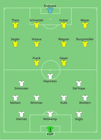 Borussia Dortmund, on the other hand, were struggling to gain ground in their second consecutive season in the Bundesliga after promotion in 1976. Three games previously, the club had secured their Bundesliga status for the following year with a 2–0 away win over FC Schalke 04.[8] Horst Bertram, Dortmund's number one goalkeeper, had just recovered from injury,[9] but Dortmund's coach Otto Rehhagel decided to start with second-choice goalie Peter Endrulat, giving him a chance to present himself. Endrulat, however, was told the morning before the game, that his contract would not be extended close-season.[10]