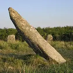 The stone circle consists of a central standing stone encircled by 19 other stones, including 18 made of grey granite and one of bright quartz, which describe an ellipse with axes of 24.9 m and 21.9 m. The position of the quartz stone in the southwest may indicate the likely direction of the sun as it moves south after All Souls'. At the northeastern edge of the stone circle are two stones in the ground which it is possible had at one time been a burial cist. The large central stone has a feet[5] or axe petroglyph. These engravings are unusual in the United Kingdom, though they can also be observed on some of the stones at Stonehenge. The rock art is only fully illuminated around the summer solstice sunrise, although there is partial illumination around the summer sunset. The circle has been aligned with the rising winter solstice sun from the Lamorna Gap.[6]