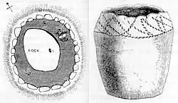 William Camden described the stone circle in his Britannia (ca. 1589) thus: "... in a place called Biscaw Woune are nineteen stones in a circle, twelve feet from each other, and in the circle stands one much larger than the rest." Camden does not mention the central stone leaning at an angle but in 1749 William Stukeley thought it may have been disturbed by someone looking for treasure. William Borlase mapped the circle in 1754 showing eighteen stones standing and one fallen, and at some time in the next hundred years a Cornish hedge was constructed through the circle. The hedge was first mentioned in 1850, by Richard Edmonds, and around 1862 the owner of the land, Miss Elizabeth Carne, had it removed and a new hedge built surrounding the stones. This is, thus, an early example of the preservation of an archaeological monument.[7] In 1864 the area around the stone circle was first studied scientifically. The excavation reports show that the central stone already had its remarkable inclination. A burial mound was discovered near the stone circle, in which urns were located. From this time originates one of the first illustrations of the stone circle, which John Thomas Blight made, when he wrote a book concerning the churches of Cornwall with notes concerning ancient monuments. He also drew a plan of the burial mound and sketched one of the excavated urns.[8]