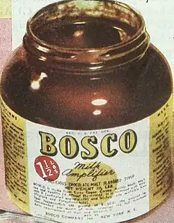 Bosco Chocolate syrup was purportedly invented in 1928 in Camden, New Jersey, by an unknown physician.[2] The William S. Scull Company, founded in 1931 in Camden, acquired the manufacturing license. The Scull Company's most famous product was Boscul Coffee, which gave the product its brand name, "Bosco".[3] In the 1950s, Corn Products Company acquired the brands Bosco, and Bosco Products, Inc. in 1985.[1] The name recalls the Ancient Greek word βόσκω (bóskō), "I nourish."