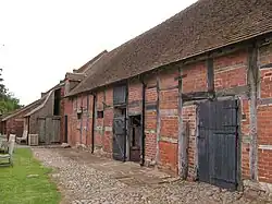 Frontage of the 16th-century farm, adjoining the 19th-century structure, seen in the background. The older building is genuinely timber framed, although the outer skin has been replaced with brick. -