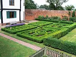 To the south are the formal gardens. First is a parterre hedged with box, laid out in recent times but occupying approximately the area of a box garden shown in 17th-century views of Boscobel. On its south-west corner is the Mount, a mound topped by a modern shelter, where Charles spent the day reading.[8]