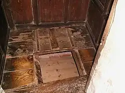 On the first floor of the main house is a bedroom known as the Squire's Room. Between a fireplace and the bed is a door into a closet, which has a trapdoor into a small "secret place", alleged to be a priest's hole. However, the space appears to be both too small and too obvious, as chimney areas were known to make good hiding places. This floor also contains another bedroom, known as the White Room. Originally, the entire first floor was probably a single large room; in the 17th century large bedrooms were used socially, while the Victorians developed the modern notion of the bedroom as a private space.