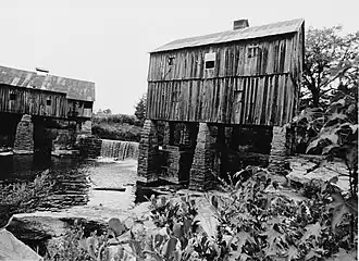 ![]() Boshell's Mill in 1973, with the sawmill on the left side of the dam and the gristmill on the right. | |