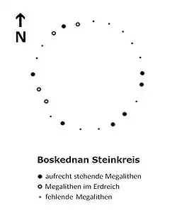 Boskednan stone circle (grid reference SW434351) is a partially restored prehistoric stone circle near Boskednan, around 4 miles (6.4 kilometres) northwest of the town of Penzance in Cornwall, United Kingdom. The megalithic monument is traditionally known as the Nine Maidens or Nine Stones of Boskednan, although the original structure may have contained as many as 22 upright stones around its 69-metre perimeter.