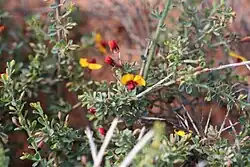 Bossiaea calcicola is a species of flowering plant in the family Fabaceae and is endemic to the far west of Western Australia. It is compact, glaucous, spiny shrub with oblong, wedge-shaped or round leaves and bright yellow, reddish and greenish-yellow flowers.