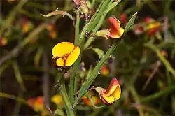 Bossiaea riparia, commonly known as river leafless bossiaea,[2] is a species of flowering plant in the family Fabaceae and is endemic to south-eastern Australia. It is an erect or low-lying shrub with flattened branches, linear young cladodes, leaves mostly reduced to small scales, and yellow and red flowers.