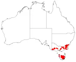 River leafless bossiaea grows in woodland and forest south from the Australian Capital Territory and the Southern Tablelands of New South Wales to scattered locations in Victoria and Tasmania.[2][4][5][9]