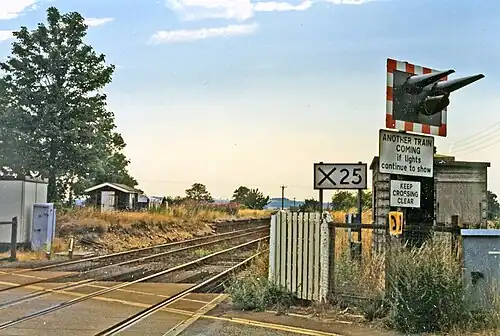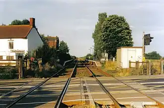 An exchange station at Barkston was opened at the junction on 1 July 1867, to facilitate passengers' journeys from the Newark direction for Sleaford and Boston, platforms being staggered on either side of the level crossing, separate from the down main line and branch.[9]
