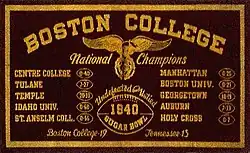 Coach Leahy, who would later cement his legendary status during an eleven-year stint as head coach at Notre Dame, took his undefeated Eagles on to the Sugar Bowl in New Orleans where they beat No. 4 Tennessee, 19–13. Tied 13–13 in the fourth quarter, Tennessee's Bob Foxx missed a short field goal attempt with three minutes remaining, and Boston College took over on its own 20–yard line. Quarterback Charlie O'Rourke led the Eagles on an eighty-yard drive, capped with his 24-yard touchdown run to seal the victory.[20]