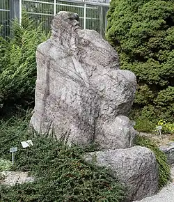 Works of art can be found at various locations in the outdoor area, such as the 1957 sculpture Pan by the Swiss sculptor Wilhelm Meier, whose works can be found in many parts of the city. The entrance area to the botanical garden at the sliding gate at the Stephanshornstrasse was designed with several large artistically crafted Rorschach sandstone shelves.