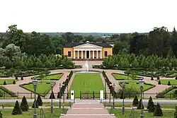 ![]() The baroque garden of the Botanical Garden, as seen from the steps of Uppsala Castle. The building in the background is the garden's orangery. | |