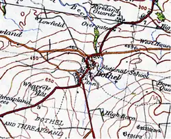 A Historical description of Bothel by Kelly's Directory of Cumberland (1897): "Bothel-with-ThreapIand form a township in Cockermouth union. The large village of Bothel is pleasantly seated on the slope of an eminence on the Wigton and Cockermouth road, 2 ½ miles south from Baggrow railway station, 7 ½ north-by-north-east from Cockermouth, and 8 south-by-south-west from Wigton, and in the Allerdale-above-Derwent ward and petty sessional division. There is a Wesleyan chapel here, built in 1889, and a Primitive Methodist chapel, erected in 1836. Bothel Hall is now a mean farmhouse, and Threapland Hall, a building of the 17th century, is also a farmhouse. Here is a boulder called "Sampson," 21 feet long and 10 above ground; on Camp Hill are remains of a Roman camp, and interments have been met with."[4]