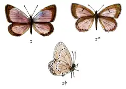 Female upperside: ground colour similar to that in the male. Forewing: costa, apex and termen very broadly dusky brownish black; over the blue area the dark veins are somewhat prominent, on the termen the black border occupies in some specimens more than one-third of the wing and in all is very even. Hindwing: the dark veins as conspicuous as on the forewing; anterior third of wing dusky black, termen with a well-marked anteciliary line and a more or less distinct and complete subterminal series of spots. Underside: as in the male. Antennae, head, thorax and abdomen in both sexes dusky black, the antennae ringed with white; beneath: palpi, thorax and abdomen white.[2]
