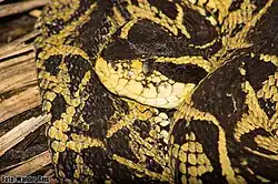The jararacussu is a fairly large pit viper; growing up to 2.2 meters long, with a robust body and head and very aggressive behavior. The color of the body and head varies widely, the background color can be brown or yellow almost black, the pattern of dark and light scales are constituted in a series of dark arches, the spots form on the dorsal midline, which look like a letter x. It has medium-sized eyes, with elliptical pupils vertically. With dorsal scales strongly keeled.[4][5]