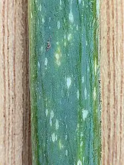 This pathogen only affects onion, garlic and leek – Allium spp.[1] The first symptom of the disease occurs in the leaves 24–48 hours after initial exposure to the pathogen, appearing as long white lesions 1–5 mm in length surrounded by a greenish-white halo. The tissue then turns soft due to pectolytic enzymes produced by the pathogen and the center of the lesion takes on a straw-color. Complete blighting can be seen about 12 days after initial infection. Symptoms towards the later stages also include leaf tip dieback and necrosis. These necrotic spots are the sites of secondary conidial production.[1][4]