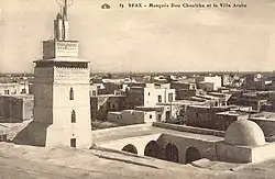 The first historical trace of the mosque Bou Chouaïcha goes back to 1857 in the inventory of the religious monuments of Sfax set by the students of the Military School of Bardo.[3] The monument is later mentioned in the writings of Abu Abbas Nouri, in his account journals, and finally in the report of the French authorities about the bombed monuments in 1881.[2]