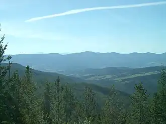 The Kettle River range has a documented history of large wildfires over the past century. Colville National Forest records attribute the smaller fire seasons in the early 1900s to wet summer conditions preventing larger conflagrations, and larger fire seasons such 1910, 1914, and 1920, to dry conditions.[20] 1929 saw abnormally dry conditions across the region, the daily high winds blowing from the south exacerbating the 6% to 10% ambient humidity.[20] Started on the eastern slope of the Kettle Range, the area of Boulder Creek south to around 12 mi (19 km) north of the Colville Reservations northern border was burned in the massive Dollar Mountain Fire[21][2] which destroyed an low estimate of 98,000 acres (40,000 ha)[20] or up to 142,000 acres (57,000 ha).[22] The fire was finally extinguished in late fall of 1929.[20]