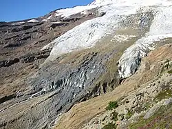 Boulder Glacier is located on the southeast slope of Mount Baker, a stratovolcano near the Pacific coast of North America in the Cascade Range of Washington.[2] Boulder Glacier is the sixth largest on Mount Baker with an area of 1.3 square miles (3.4 km2).[3] It flows from the summit crater between Grant Peak (10,781 ft (3,286 m)) and Sherman Peak (10,141 ft (3,091 m)) to about 5,000 ft (1,500 m). It is noteworthy for retreating 1,610 ft (490 m) between 1987 and 2008, leaving newly exposed rock and soil behind.[4]