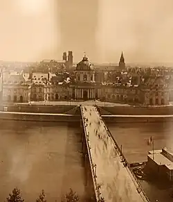 Contemporary photographic techniques and limitations may have influenced Monet’s painting. Due to the slow shutter speeds of early cameras, moving objects were often blurry in photographs. The blurred pedestrians in the painting are reminiscent of how a camera from the period would capture individuals walking at a normal speed.[14] Adolphe Braun, a prominent photographer of the time, may also have been an influence on Monet. Braun's photographs from a high vantage point, capturing blurred figures beneath a high horizon, are similar to Monet’s view of Boulevard des Capucines from the elevated second story of Nadar’s studio.[2][6] Monet’s blurred pedestrians walking on the boulevard evoke the people crossing Pont des Arts in Braun's photograph Panorama of Paris, which was captured from the Quai du Louvre.[15]