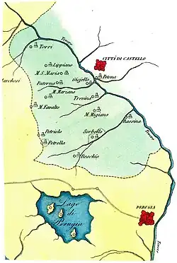 - ^ Known for his liberal sympathies and for his contacts with Enlightenment and pro-French circles, he came into conflict with the Sorbellos and, after the Restoration, he was arrested by the Sorbello marquises. Initially imprisoned at the Rocca Paolina in Perugia, he was then exiled to the Grand Duchy of Tuscany, where he continued working as a geographer until his death. See Bartolomeo Borghi, Notizie appartenenti alla storia naturale del Lago Trasimeno oggi detto di Perugia, 1777, Transcription and comments edited by Francesco Girolomi and Giuseppe Dogana, Magione, UMBRALABEL, 2007.
