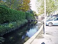 Bourne Eau rises in The Wellhead, otherwise known as St Peter's Pool, in Bourne.[3] The Wellhead is a natural artesian spring, rising from the limestone some 165 feet (50 m) below the land surface.[4] It once formed the source of the water defences for Bourne Castle as well as the power for the town's three mills.[3] From the Wellhead, a branch flows to the east, along the southern edge of the castle site, while another flows north, then east and south, enclosing the castle site and Wellhead Gardens to rejoin the first branch near Baldock's Mill. A culvert carries the water under South Street, and it flows along the edge of Church Lane,[5] where it is crossed by a small cast-iron bridge with gates, providing rear access to Bourne Eau House.[6] It carries the date 1832. On the other side of Church Lane is the parish church of St Peter and St Paul, a grade I listed structure that was originally the chapel for an Arrouaisian order of Canons founded in 1138.[7]
