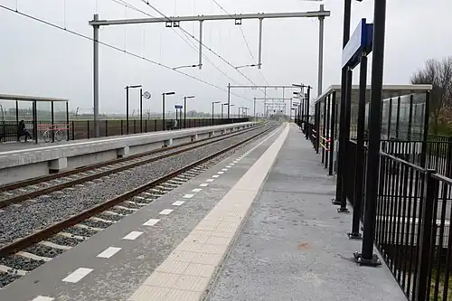 The station opened on 16 Jul 1885 as Buldersteeg. It was renamed Boven-Hardinxveld on 15 May 1927.[1] The station was closed on 15 May 1934, but reopened on 16 April 2012.[2] The station lies on the MerwedeLingelijn (Dordrecht - Geldermalsen). The station is primarily for Hardinxveld and small settlements in the area. Trains can pass each other here, the station has a double track . Train services are operated by Qbuzz.