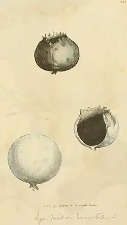 The genus was originally described by mycologist Christiaan Hendrik Persoon in 1794. He described the genus as "Cortice exteriore libero evanefcente, pileo acauli demum glaberrimo, vertice irregulariter rupto" ("Exterior cortex vanishes, cap stemless becoming smooth, irregularly breaking the top").[1] Synonyms include Piesmycus (Rafinesque 1808), Piemycus (Rafinesque 1813), Sackea (Rostkovius 1844), Globaria (Quélet 1873), and Pseudolycoperdon (Velenovský 1947). Bovista plumbea is the type species.[2]