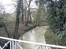 Another stream which rises in Monk Sherborne Wood flows northwards to join the main stream as it passes under the A340 Aldermaston Road. Beyond the bridge it passes through woodland, known as Pamderend Gully Copse and Pamderend Moor Gully Copse. A tributary which also rises in Monk Sherborne Wood joins from the south, and another which begins as a spring in Cranes Copse joins close to a ford where a track crosses the river. This was also the point at which a Roman road crossed the river. In Wiltshire's Gully Copse, a stream which is known as Old Ponds joins from the north. This begins as two branches near Pamber Green, which join to flow eastwards under a bridge at Little Loddon, and Boar's Bridge before turning to the south to join Bow Brook. This continues through woodland, and passes over a weir at Tumbling Bay, to reach Beaurepaire Mill.[1] The square mill building was built in the 1870s or 1880s for the Beaurepaire estate, but has now been converted into a house.[4] The rather larger mill house dates from the same time, although it was extended in the 20th century.[5] The river continues beneath a bridge dated 1831, which consists of five elliptical cast-iron girders supporting plates on which the roadway is constructed. The balustrades are made of wrought iron, and the abutments are of brick and stone.[6]