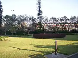 The trees and shrubs on the RNA northern boundary form a screen and edge to the eastern spaces of the Park. A gravel vehicle path from O'Connell Terrace to the Brisbane City Council depot runs beside the curved edge boundary bed which contains a mature rubber tree (Ficus elastica). The depot is housed in the space beneath the RNA grandstand built to this boundary. The curved bed and the kidney shaped beds in the area are planted with hedges (Acalypha sp.) and shrubs. Prominent trees include the English oak tree (Quercus robur), Phoenix palm (Phoenix sp.) and English elm (Ulmus sp.). A pair of ornamental beds planted with colourful cannas (Canna sp.) edges the lower path into the Park.[1]