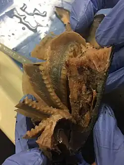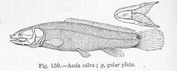Bowfin are often referred to as "living fossils" or "primitive fish" because they retained some of the primitive characters common to their ancestors,[22] including a modified (rounded externally) heterocercal caudal fin, a highly vascularized gas bladder lung, vestiges of a spiral valve, and a bony gular plate.[22][23] The bony gular plate is located underneath the head on the exterior of the lower jaw between the two sides of the lower jaw bone. Other distinguishing characteristics include long, sharp teeth, and two protruding tube-like nostrils.[16] Unlike all of the most primitive actinopterygians, the scales of bowfin differ in that they are not ganoid scales, rather they are large, single-layered cycloid scales closer in similarity to more derived teleosts.[24][25]