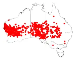 A ramulosa is native to a large area of arid parts of Australia. It is found in southern Queensland, western New South Wales, the southern parts of the Northern Territory, northern and central South Australia and the Goldfields and the Mid West regions of Western Australia, often occurring in red sandy[1] and loamy sandy soils in swales. It is also found on shallow stony soils among with outcrops of laterite and can form dominant stands on the southern and eastern ends of its range.[4]