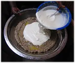 In many cultures, food and drink are shared in a communal bowl or cup.[3] In Mali, the name of the town of Bandiagara (French pronunciation: [bɑ̃djaɡaʁa]) refers to the communal bowl meals are served in. The name translates roughly to "large eating bowl." In Zimbabwe, sadza is traditionally eaten from a communal bowl, a tradition that is still maintained by some families, mainly in rural areas. Lakh is a popular boiled porridge made with rolled millet flour pellets (araw/arraw) typically topped at serving with sweetened fermented milk. It is usually served in a communal bowl or platter in Senegal.