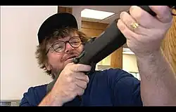 An early scene depicts a bank in northern Michigan that gives customers a free hunting rifle when they make a deposit of a certain size into a time deposit account.[14] The film follows Moore as he goes to the bank, makes his deposit, fills out the forms, and awaits the result of a background check before walking out of the bank carrying a brand new Weatherby hunting rifle. Just before leaving the bank, Moore asks: "Do you think it's a little dangerous handing out guns at a bank?"[15]