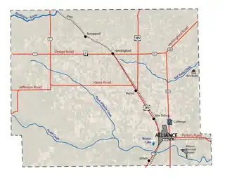 Box Butte County is a county in the U.S. state of Nebraska. As of the 2020 United States census, the population was 10,842.[1] Its county seat is Alliance.[2] The county was formed in 1886; it took its name from a large box-shaped butte north of Alliance. In the Nebraska license plate system, Box Butte County is represented by the prefix 65 (it had the sixty–fifth largest number of vehicles registered in the county when the license plate system was established in 1922).