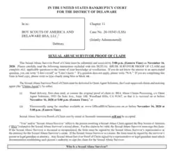 On February 18, 2020, the Boy Scouts of America filed for a Chapter 11 financial restructuring to offer "equitable compensation" to survivors and their families. The BSA cited approximately 200 pending lawsuits in state and federal district courts across the United States and 1,700 potential claimants in total. In May of that same year, the U.S. Bankruptcy Court for the District of Delaware set November 16, 2020, at 5 pm EST as the bar date for all survivors of sexual abuse; 92,700 sexual abuse claims were filed with the bankruptcy court by the deadline.[8]