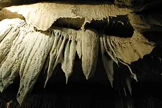 Regular tours of the cave are given by a licensed guide company from the last Friday in April to mid November.[5] The tour includes the Pancake Room, a stalactite group called the Upside Down City, and a flowstone formation called Mother Nature's Wedding Cake. In the Bat Grotto bats spend summer days sleeping. The Drapery Room contains curtains, soda straws and helictites. The tour ends at a small subterranean stream. 0.63 miles (1.01 km) of the cave have been mapped.[3]