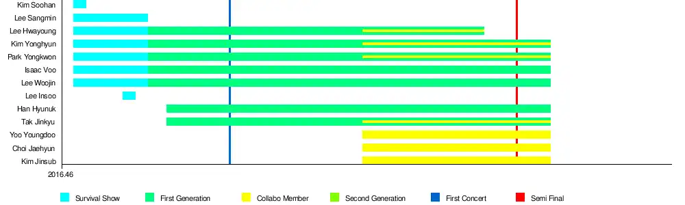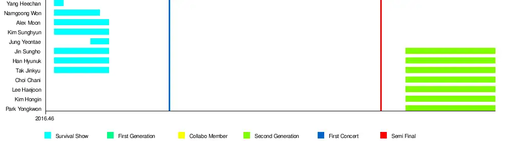 After completing 260 concerts,[3] the final group was selected from "The Final", consist of eight members: Yoo Youngdoo (Yoo Jiahn), Jeong Yeontae, Hwang Inho, Han Hyunuk, Isaac Voo, Lee Inpyo, Kim Jinsub and Kim Sunghyun. They debuted on October 26, 2017 as IN2IT.[12]