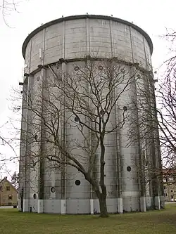 The water tower is built in reinforced concrete. It has a round foot print and pilasters at close intervals. The lower part of the structure has round windows in a helix arrangement. It has a diameter of 20 m and is 34 m tall.[1][2]