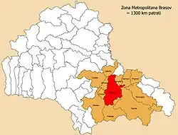 The Brașov metropolitan area is a metropolitan area in Brașov County, Romania, that includes the municipality of Brașov and 12 other nearby communities. It was constituted in 2007[2] with the aim of creating business opportunities, building and administering of living spaces and recreational areas, to attract more consistent investment, and to coordinate better environment and infrastructure projects. As of 2021, the metropolitan area has a population of 371,802, of whom 237,589 live in Brașov.[1] The total area is 1,368.5 km2.