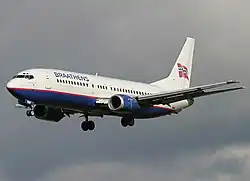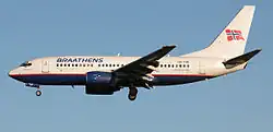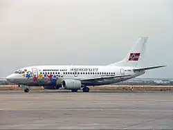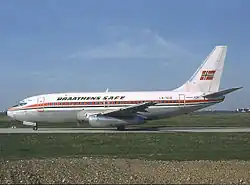 From the establishment, Braathens SAFE's aircraft livery had a thick red and thinner white and blue cheatline, with the Flag of Norway on the vertical stabilizer.[95] With only slight modifications, this general design was continued to and including the 737-400 and -500 aircraft.[96] A new livery with a stylized grey wing as logo on the vertical stabilizer and a blue belly was introduced in 1998 with the delivery of the 737-700.[67] The logo was replaced with the Flag of Norway in 1999.[76][77] Only some of the early Douglas aircraft were named, and those that were started with "Norse". The Heron were given common Norwegian male names. The three last F-27 and newer aircraft were all named for kings of Norway.[93]