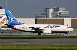 The airline bought Transwede Airways in 1996, the second-largest domestic airline in Sweden.[60] The goal was to integrate the networks, starting on 18 June with a new service between the two capital cities, one of SAS' most profitable.[57] Braathens announced in 1997 the order of six 134-seat Boeing 737-700,[61] while Transwede started replacing its Fokker 100s with 737s.[62] Transwede changed its name to Braathens Sverige later that year.[63]