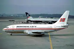 Kristiansund Airport, Kvernberget opened in 1970 and Molde Airport, Årø in 1972, with Braathens SAFE granted permission to operate the routes.[27] The airline also received permission to operate from Bergen via either Ålesund, Molde or Kristiansund to Bodø and Tromsø.[28] Between 1975 and 1977, the last three F-27 were sold to sister airline Busy Bee, which took over some of the smallest services. "Green Routes" were introduced from 1976, which offered discounts on certain flights with strict conditions.[29] Founder Ludvig G. Braathen died on 27 December 1976, while still acting as chief executive officer (CEO). He was replaced by his son Bjørn G. Braathen.[30] During the 1970s, Braathens SAFE took delivery of eleven 737s, including one with a cargo door, and three with extended range which allowed for non-stop flights to the Canary Islands.[31] Discounted "summer tickets" were introduced from the early 1980s which increased load factor.[32]