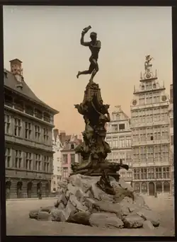 The Brabo Fountain (Dutch: Brabofontein) is an eclectic-style fountain-sculpture located in the Grote Markt (main square) of Antwerp, Belgium, in front of the City Hall. The fountain, dating from 1887, contains a bronze statue by the sculptor Jef Lambeaux depicting the city's legendary founder, Silvius Brabo, throwing the severed hand of the giant Druon Antigoon into the river Scheldt.[1] It received protected status in 1982.[1]