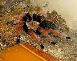 Brachypelma boehmei (also known as the Mexican fireleg,[4] or the Mexican rustleg tarantula) is a tarantula native to Mexico in Guerrero state.[5] These long-lived tarantulas prefer burrowing and hiding in dry scrubland. As with all closely related tarantula species, they defend themselves with urticating hair when provoked.