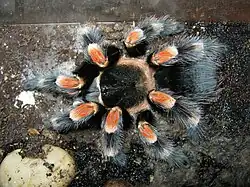 Brachypelma smithi is a species of spider in the family Theraphosidae (tarantulas) native to Mexico.[3] It has been confused with Brachypelma hamorii; both have been called Mexican redknee tarantulas.[4] Mexican redknee tarantulas are a popular choice as pets among tarantula keepers. Many earlier sources referring to B. smithi either relate to B. hamorii or do not distinguish between the two species. B. smithi is a terrestrial tarantula native to Pacific coast of the Mexican state of Guerrero.[4]